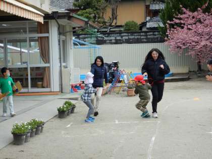 園庭で親子混合リレーをしました。子どもからお家の人へとバトンをつなぎ、白熱したいい勝負になりました。お家の人の全力の走りに子どもたちの応援にも力が入りました。お家の人からは「もう1回戦したかった!」という声も挙がり、子どもたちと楽しんで下さる姿が嬉しかったです。