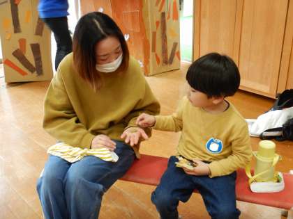リレーの後はおいしいクッキーをいただきながら、ほっこりした時間となりました。おやつタイムの後は生活発表会の劇遊びで使った道具などをお家の人に嬉しそうに見せる姿もありました。