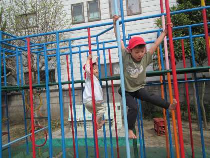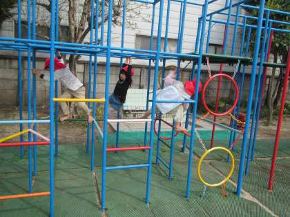 体も大きくなってきた年長児は「こんなん簡単や〜」と登り棒を登ったり、綱渡りをしたり、ジャングルジムでいっぱい楽しんだり・・