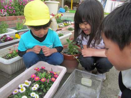 「あっ、蝶々が生まれた〜」と昨年の5歳児が大切に育てていた虫ケースから蝶が飛び立つのを見届けたり・・・