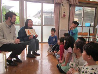 すっかり仲良くなった子どもたちは、今日は数字や色、動物などの絵を見ながら「これは英語で何というでしょう?」とえいごのふれあい遊びを楽しみました。