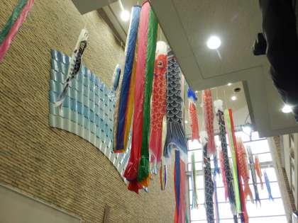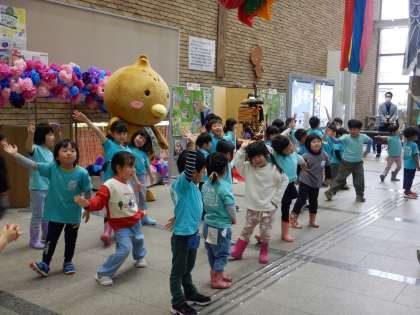 こどもの日の集いの後は、4・5歳児で深草支所へ出かけ、『深草支所 鯉のぼり等の展示と幼稚園児によるステージパフォーマンス』の催しに参加しました。到着すると、入口ホールには、たくさんの鯉のぼりと吹き流し、立派な五月人形が飾られていました。マスコットキャラクターの深草うずらの「吉兆くん」も子どもたちを待っていてくれました。
