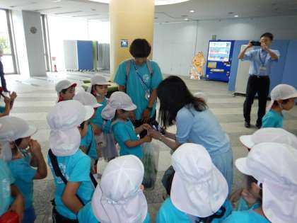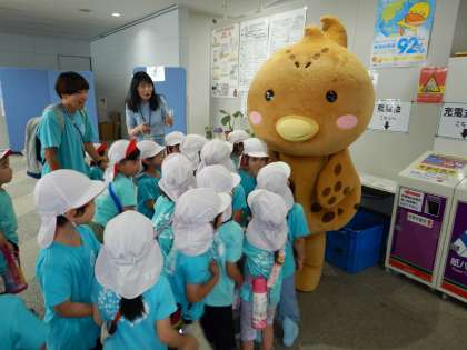今年度は、春にこいのぼりパフォーマンスでお世話になった、深草支所にも5歳児が苗のおすそわけに出かけました。マスコットキャラクターの深草うずらの「吉兆くん」との再会も、子どもたちにとっては楽しみのひとつでした。深草支所の方にご挨拶をし、花の苗を届けたあと、吉兆くんにも苗の袋を手渡すと、子どもからは