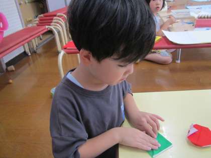 7月の折り紙遊びではそら組(5歳児)は『トマト』、にじ組(4歳児)は『アイスクリーム』を折りました。