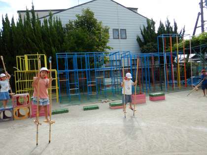 朝の支度をすると園庭に出て、そら組の子どもたちは竹馬に、にじ組の子どもたちは三角馬にチャレンジしています。様々なコースにチャレンジしたり、自分でスタートとゴールを決めて長い距離を歩くことにチャレンジしたりと、それぞれの子どもが自分なりに挑戦しています。