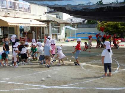 今日の運動会では、4・5歳児で玉入れをしました。4歳児にじ組の出番の時は、5歳児そら組が応援し、5歳児そら組の出番の時には、にじ組が応援し、最後はみんなで力を合わせて楽しみました。