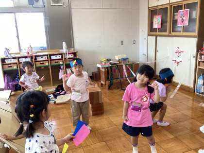 自分の手裏剣をつくって狙って投げたり、走りながら投げたりなど、毎日新しい技が生まれています。イメージをもってなりきりながら、体を動かす楽しさを感じていきたいと思います。