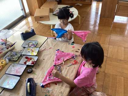4歳児にじ組の子どもたちは、蝶やカブトムシ、クワガタなどの虫になりきって遊ぶことを楽しんでいます。今日は子どもたちがそれぞれ好きな色でつくった虫の羽に、キラキラ光るオーロラ紙やモール、リボンなどを使って飾りつけをしました。