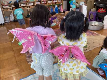 「こんなのもつけてみようかな」「見て!きれいでしょ?」とどんどん飾りつけをして自分だけの特別な羽に変身させていました。出来上がった羽は「お家の人にも見てもらいたい!」と嬉しそうに付けて帰る子どももいました。