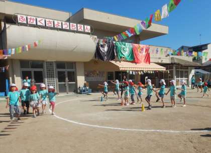 まずは入場行進。4・5歳児の異年齢ペア『幼稚園きょうだい』と一緒に、腕を振って、足を上げて元気よく行進!さあ、いよいよ運動会の始まりです!