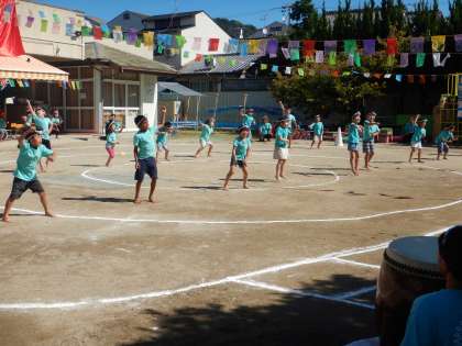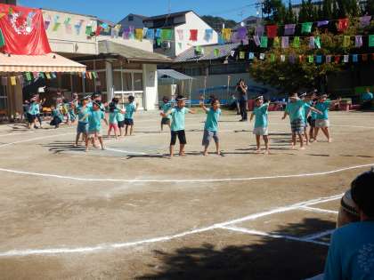 プログラム8番 よさこいソーランでは、5歳児そら組が、漁師になり切ってねじり鉢巻きを頭に着け、勇ましく登場!4歳児の忍者のダンスと違って、表情、手足、声に力がこもっているのが伝わりました。最後は、21人が円になり、みんなで顔を見合わせ、声を出し合い、力と心を終結させ、見事踊り切りました。