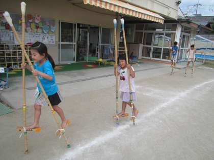 今日は毎日楽しんでいる竹馬で競争してみたり、鬼ごっこを楽しむ姿もありました。