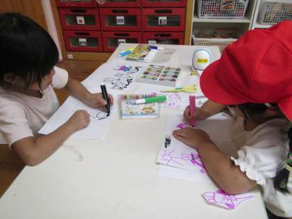 「先生、白い紙とペンを出して!」「いっぱいかけたら本にしたいねん」と今日の二人は仲良くお絵かきを楽しんでしました。