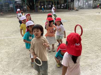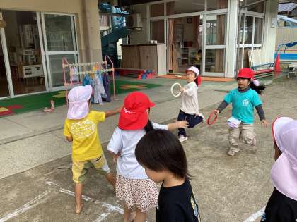 お家の人に見てもらう運動会を終えてから、5歳児そら組の幼稚園きょうだいと一緒に4歳児にじ組も体操当番をしたり、綱引きやリレーをしたりして運動遊びを楽しんでいます。