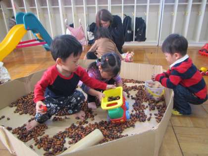 そして・・・「どんぐりおふろもいかかですか?」「今日は少しお湯(どんぐり)が増えましたよ!」とどんぐりをかぶってみたり、またまた滑り台も入れてゴロゴロと転がしてみたり・・友だちと一緒にどんぐり遊びも楽しみました。