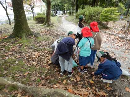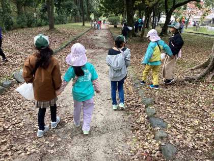 11月7日。4・5歳児が深草小学校1年生のお兄さん、お姉さんと一緒に交流をしました。近隣の公園で待ち合わせの約束をして待っていると、横断歩道を渡って来る小学生の姿が見え「おーい!」と手を振って迎えました。絵カードを手がかりに、同じグループのお兄さん、お姉さんを探し、自己紹介をしていた時にはドキドキしたり戸惑ったりしていた子どもたちも、秋の自然物を見つける『秋みつけ』をしているうちに、だんだん心がほぐれてきて、手をつなぎながらおしゃべりをしたり、「こっちにドングリあったで」と自分から話しかけたり、逆に「〇〇くん、あっちいこう」「△△ちゃんも見つけた?」などと名前を呼んでもらったりする姿も見られました。