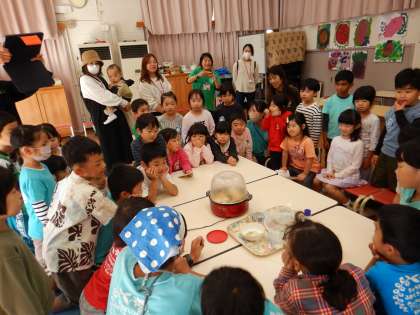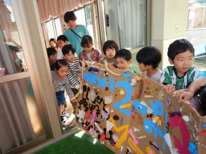 11月14日の『ぽっぷこーんおいもぱーてぃー』に向け、5歳児は、案内状、チケット、看板づくりなどのお店屋さんの準備を進めてきました。当日は朝からみんなで出来上がった看板の取付や会場になる遊戯室の飾りつけを始めました。その後、4歳児も呼んで、みんなでポップコーンが弾ける様子をワクワクしながら見ました。この日はちょうど参観日でもあり、お家の人も一緒に見守りました。ポップコーンが次々に弾けていく様子に子どもたちは
