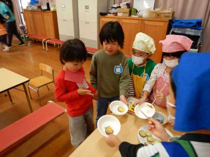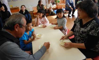 などと5歳児同士で声を掛け合う姿も出てきました。4歳児も同じテーブルで楽しく会食しているうちに、地域のなかよし会の方にもどんどん親しみがわいていきました。