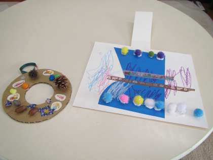 おうちの人と一緒に、木の実を飾ったり、シールをはったり、ふわふわキラキラの飾りをつけたりして製作を楽しみました。