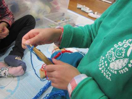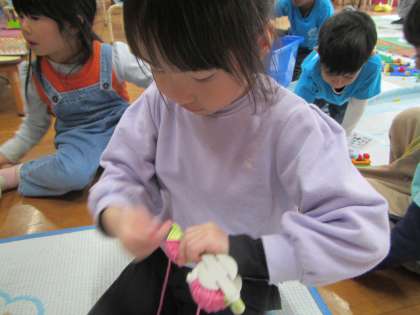 「今日は何色の毛糸で編もうかな…」と毛糸遊びを楽しむ子どもたちです。
