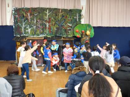 全身で鳥居を表現したり、忍者の術を披露したり、生き生きとした姿が見られました。自分のせりふを役になりきって話したり、大道具を動かしたり、効果音も自分たちで鳴らしたりなど、そら組のみんなでつくり上げたお話を最後まで演じ切りました。