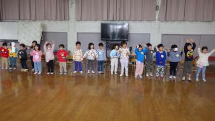 毎日元気いっぱいのひよこ組の子どもたち。おうちの人と一緒に好きな遊びを楽しんだ後、お遊戯室でお楽しみ会をしました。