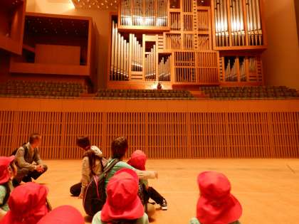 京都コンサートホールの方に案内していただき、普段は通れない裏の入り口から大ホールのステージに入り座っていると、後ろから素敵な音色が聞こえてきました。振り向いて見てみると、大きなパイプオルガンが!