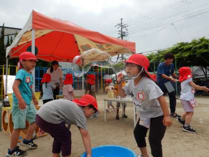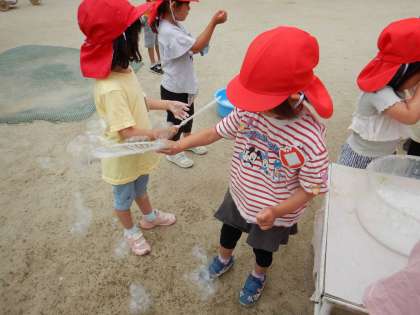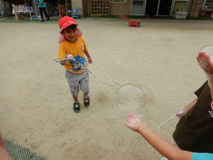 とまたまた偶然できたシャボン玉に心躍ります。子どもたちは先生をモデルにして遊び方を知りますが、あとはどんどん自分たちで動き出し、試し、偶然に出会い、感じ、気付いていきます。
