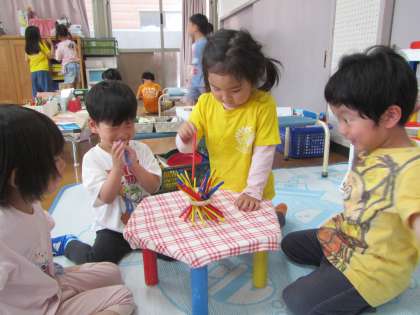 「あっ、これやりたい。入れて」「いいよ」みんなでリング内の棒か倒れないよう、ハラハラしながら遊び楽しみました。