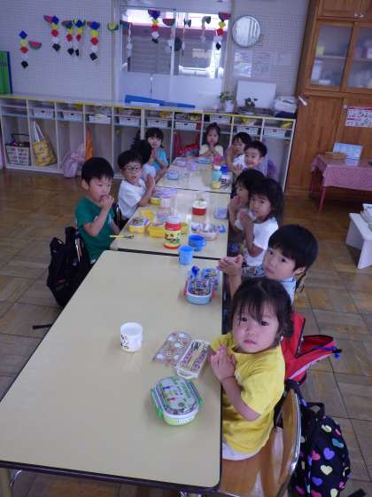 毎日プールでの水遊びを楽しんでいるひよこ組の子どもたち、今日はお楽しみのお弁当日でした。いっぱいお水で遊んでお腹もペコペコ。「いただきまーす」と嬉しそうに食べていました。
