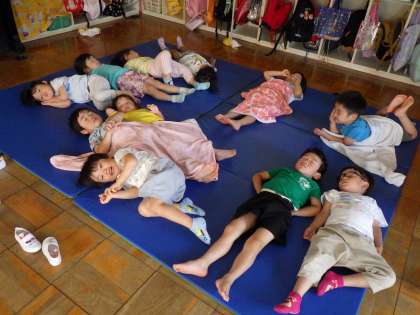 お弁当の後はマットを敷いて、電気を消して横になりました。目をつぶってみたり、お友達と手を繋いでみたり、ほっこりした休息タイムを過ごしました。
