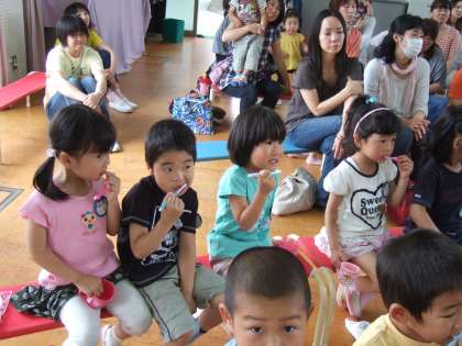 親子共に真剣に話しを聞き,なぜ歯磨きをするのかを学びました。
