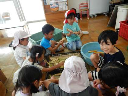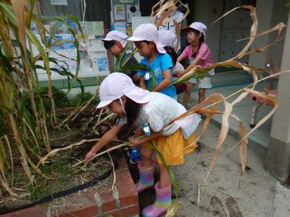 夏休みが明け、幼稚園に植えたポップコーンの背がどんどん大きくなってきたので、子どもたちで力を合わせて収穫することにしました。