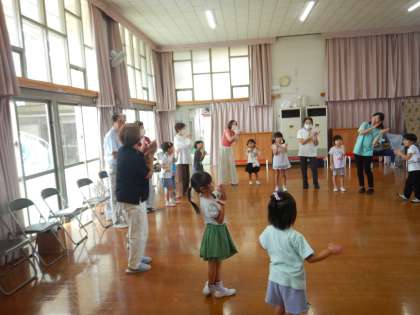 などと互いに声をかけあう場面があり、初めましての祖父母の方とも自然と触れ合える機会となりました。また、遊戯室でのクラス活動では、一緒に玉入れやダンスを楽しむうちに、今日は祖父母の方が来られなかった子どもたちからも笑顔がこぼれました。