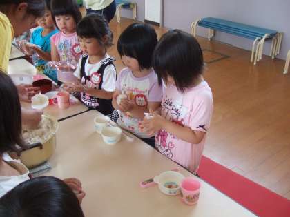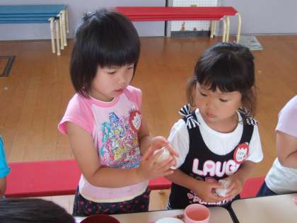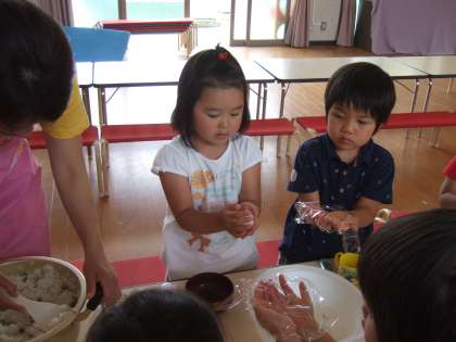そして,5歳児・4歳児共,小さな手で豆ご飯のおにぎりを