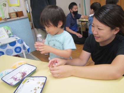 9月の未就園児クラスたまご組・ぷちひよこ組では、小さなキラキラ光るビーズと魔法の水を入れて『キラキラボトル』をつくって遊びました。