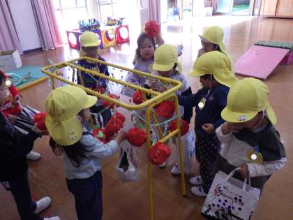 遊戯室においしいものが入った手作りカバンを持って行き、「ミニうんどうかいごっこ」をしました。