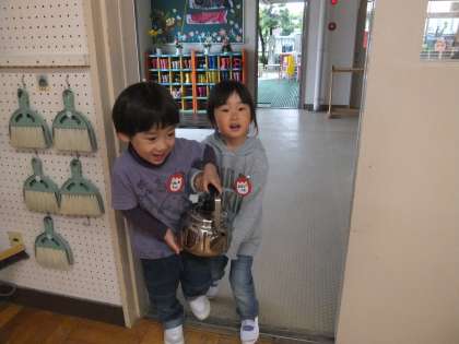 「にじ組のお茶をください」と言い,保育室までこぼさないように運びます。