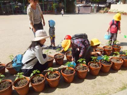 先週植えたピーマンの苗に,朝,登園してきた親子から順に水やりを始めました。今日は週明けで,また朝から汗ばむ夏日,ということもあり,土がぐんぐん水を吸いこんでいきます。「飲んでる!」とうれしそうに何度も何度も水やりするわが子に,「もうお腹いっぱいっていってるよ」と言いながら説得するおうちの人の姿も,なんともほほえましかったです。