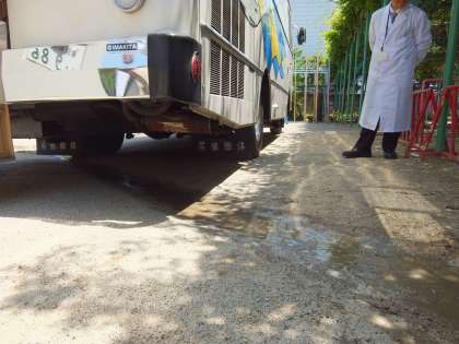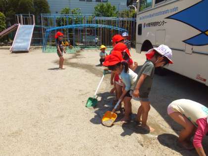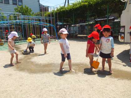 砂場の水道から思い切り水を出した勢いで,園庭に川ができました。「うわ!川ができてる!」と子どもは大興奮。自然にできるぐねぐねの川をつたって子どもたちの列ができました。そして,川はどんどん長くなり,ついに健診に来てくださっていた車の下を通っていきました。「うわぁ!!トンネルをくぐってる」「まだ続いてるで」とまたまた大興奮の子どもたち。車の下をのぞいている子どもたちを,健診の方もほほえましそうに見てくださっていました。