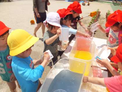 先週,花びらのジュース(色水)づくりをしていた時に,色に興味をもって楽しんでいたので,今日は赤,青,黄の色水で遊ぶことにしました。カップや卵パックにほしい色をすくっては,ソーダやイチゴなどのジュースに見立てて遊んでいるうちに,混色を楽しみ始めました。