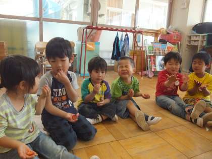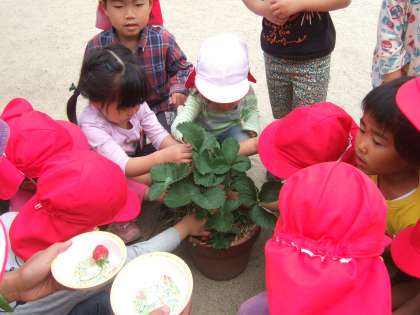 幼稚園で育てているイチゴがだんだんと赤くなってきて,食べられるのを今か今かと待っていた子どもたち。お昼から,「イチゴ狩りしよう!」というと大喜びで植木鉢の周りに集まり,おいしそうなイチゴを摘みました。年長組さんに,お先にどうぞ,と言ってもらい,今日は,年少組で食べることになりました。みんなで食べられるようにと,職員さんに切ってもらってる間は遊んでいたのですが,「イチゴタイムしよう!」と言うと,いつもはなかなか片付かないおもちゃが一気にスッキリ!!