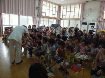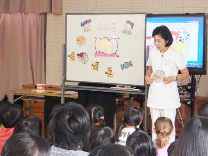 歯科衛生士さんに来ていただき,虫歯予防についての紙芝居を見せてもらったり,実際に歯ブラシを持って歯の磨き方を教えてもらったりしました。