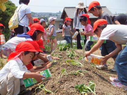 空の牛乳パックに水を入れて,たっぷり水やりもしました。