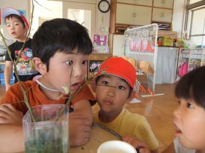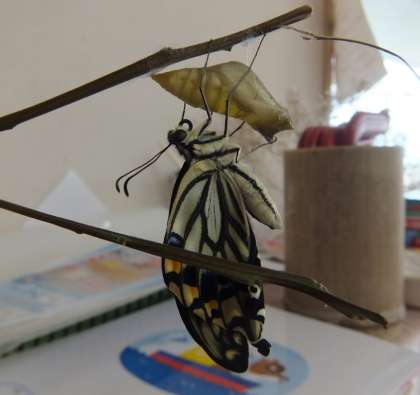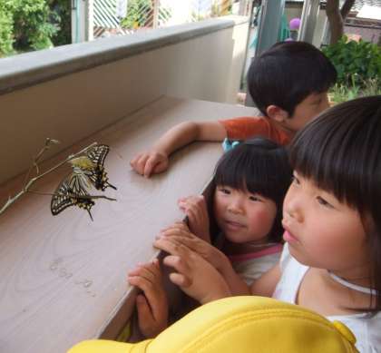2匹目のサナギも色が変わってきました。今回も帰り支度をしている最中の羽化でした。休日前ということもあって,子どもたちと話し合ってアゲハチョウがとまっているみかんの枝を外に置いて飛び立てるようにすることにしました。「さようなら」をしてからも,園庭開放で遊びながらもなんども様子を見に来て,アゲハチョウの飛びたちを見送りました。