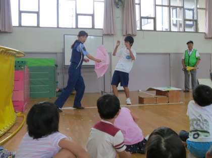 伏見警察署から指導のお巡りさんとボランティアさんにお越しいただいて,今年度第1回目の親子交通教室を行いました。来年は小学生になって一人歩きを始めることになるそら組の親子が参加しました。道路の安全な歩き方や傘の扱い方などを教えていただきました。