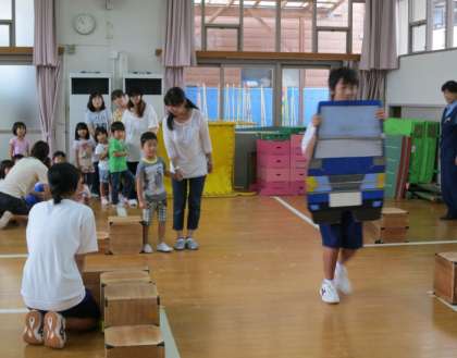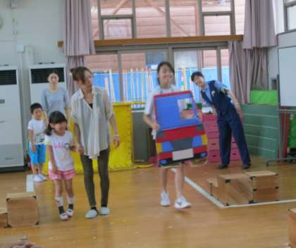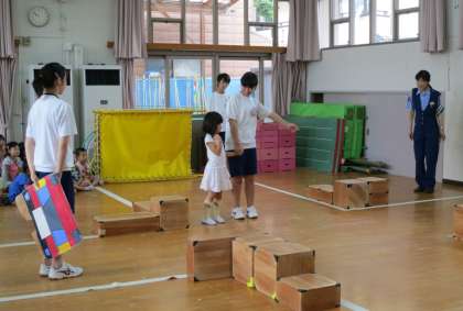 お話の後は,実際に道路を歩く訓練です。遊戯室につくられた仮設道路を親子で歩きます。左右の確認は,大丈夫でしょうか。職場体験学習の中学生のお兄さん先生とお姉さん先生もデモンストレーションや自動車役で大活躍でした。