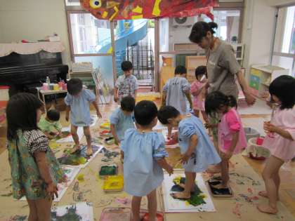 今日は残念ながら,雨天のために親子遠足は延期です。でも,幼稚園では,元気いっぱい子どもたちは楽しく遊びました。にじ組では,今日は絵具あそびをしました。手や足に絵具をいっぱいつけて,ヌルヌルした感触や色の変化を楽しみました。ダイナミックに,そしてじっくりと意欲的に遊ぶ子どもたちの姿がとても嬉しく感じた一日でした。