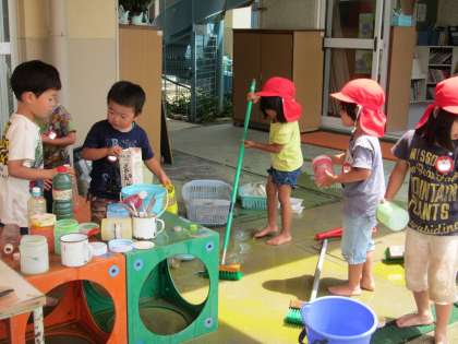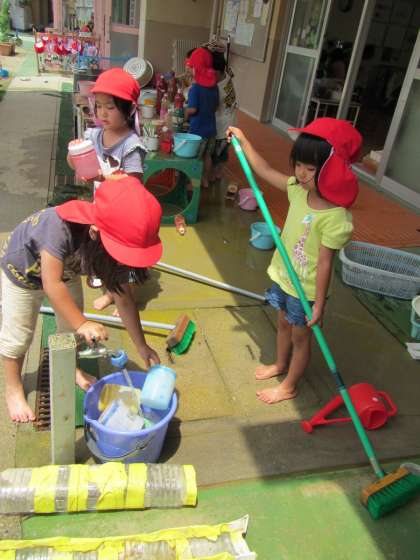 「こんな色になった!」といろいろな色を混ぜ,変化することを発見したり,容器を移し替えることを楽しんだりしています。保育室前のテラスは色水だらけ・・。でも色水の後の掃除は子どもたちに大人気!デッキブラシやホースを使いたくて,違う遊びをしていた子どもまで積極的に参加してきます。「私は洗い物するわ」と,絵の具のついた容器を水で洗うのも楽しいようです。何をするのも楽しみに思えるってステキですね。