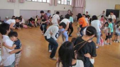 全園児親子が遊戯室に集い,歌に合わせて体を触れ合って遊んだり,音楽に合わせて踊ったりして遊びました。